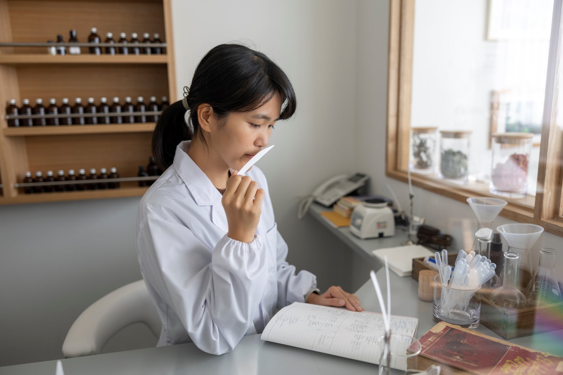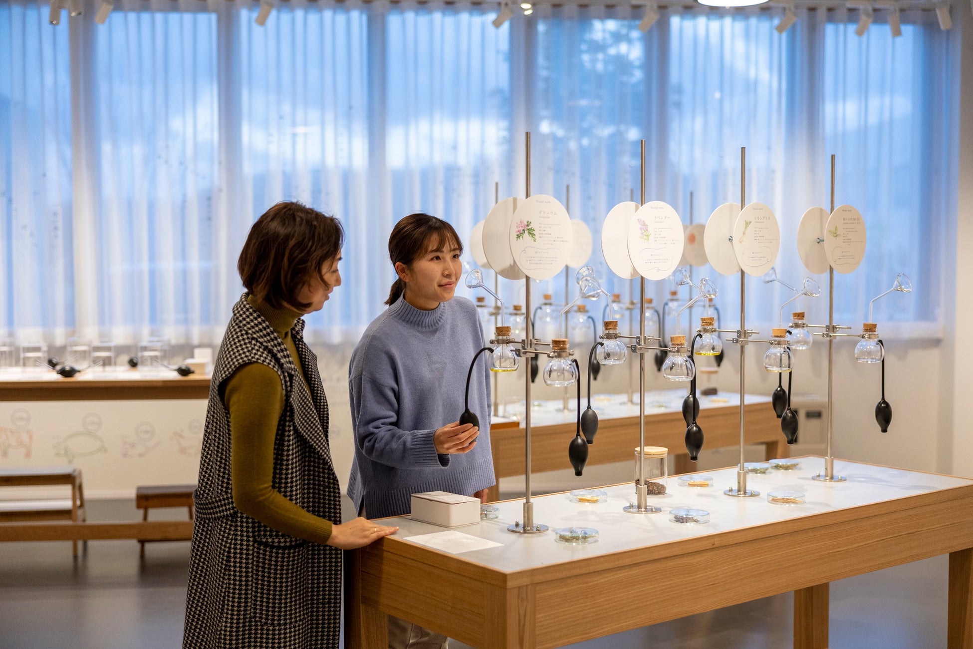 私は香りを通じて、お客様に北海道の自然であったり、季節の風景であったり、どこか別の世界を旅しているような特別な体験をお届けしたいと思い、日々香りをつくっています。香りづくりを支えるのは、植物の力と化学の力。さらに感性や思いといった、人の力がとても大切です。香りのラボは、自然と化学と人が作り出す多彩な香りを大人も子どもも楽しみながら感じることが出来る場所です。