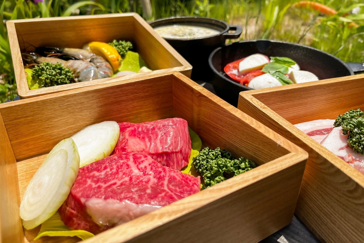 美味食材に恵まれる兵庫県産の食材にこだわり、新鮮な素材の数々が並ぶグランピングBBQ。各棟個別に設置されたBBQスペースを備え、ゆっくりとこだわりのお食事をお楽しみいただけます。