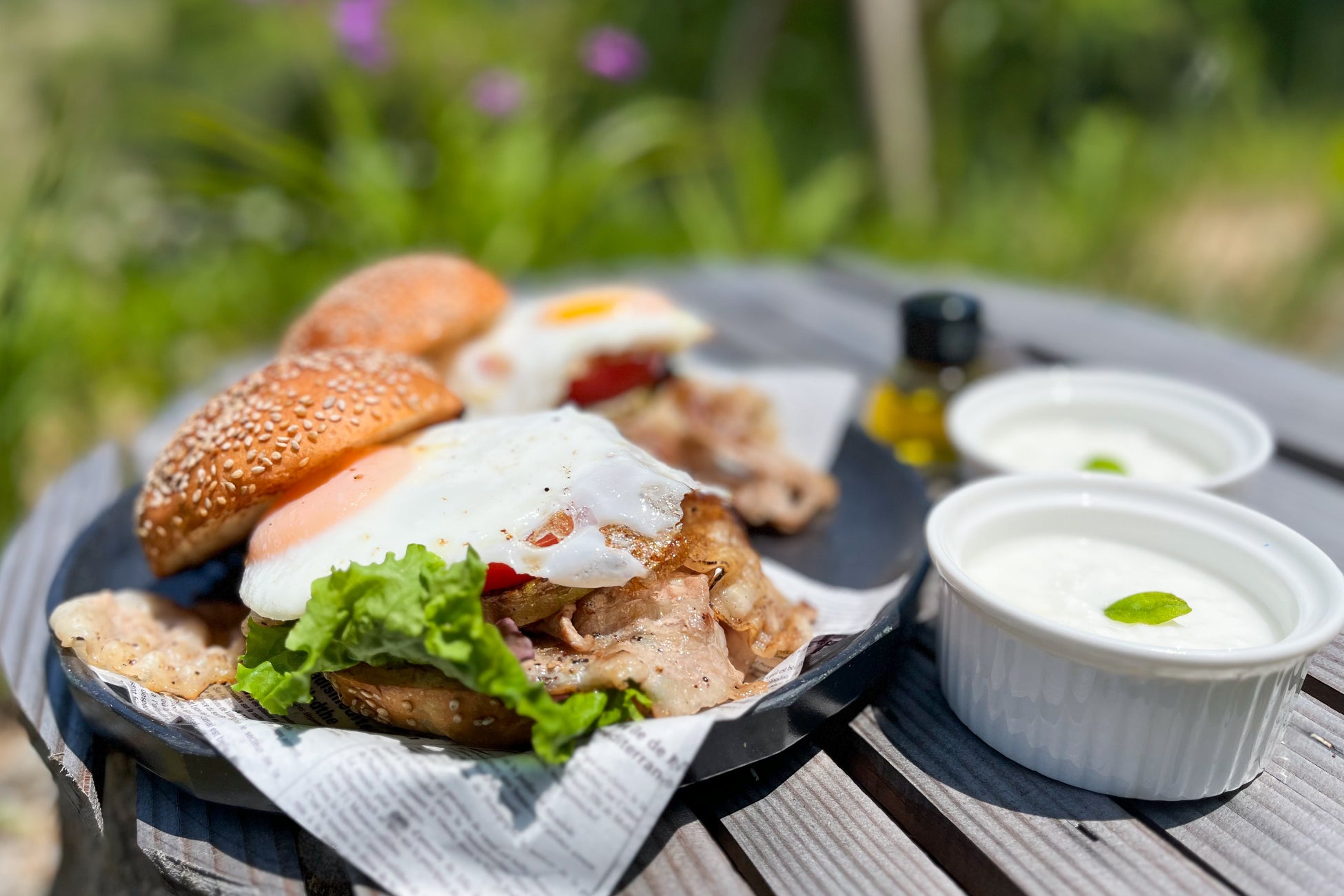 地元日光のブランド牛「霧降高原牛」ステーキをメ インに日光 HIMITHU 豚のソーセージ、とれた て野菜に湯葉スープなど地元食材にこだわったバー ベキュー、朝は日光御用卵と厚切りベーコンでイング リッシュマフィンに舌つづみ、質も量も大満足との お声を頂いております。