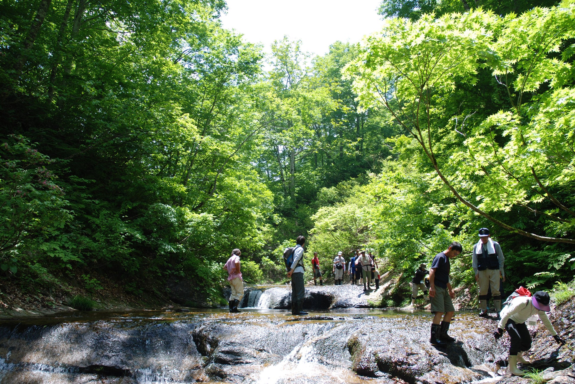 「恵みの森」はブナの天然林の中を沢が流れる、人気のトレッキングスポットです。1日目はここで沢歩き体験を行います。沢の中をじゃぶじゃぶ歩きながら、雄大な自然の風景を楽しむことができます。自然ガイドが同行いたしますので、トレッキング初心者の方でもお気軽にご参加ください。
