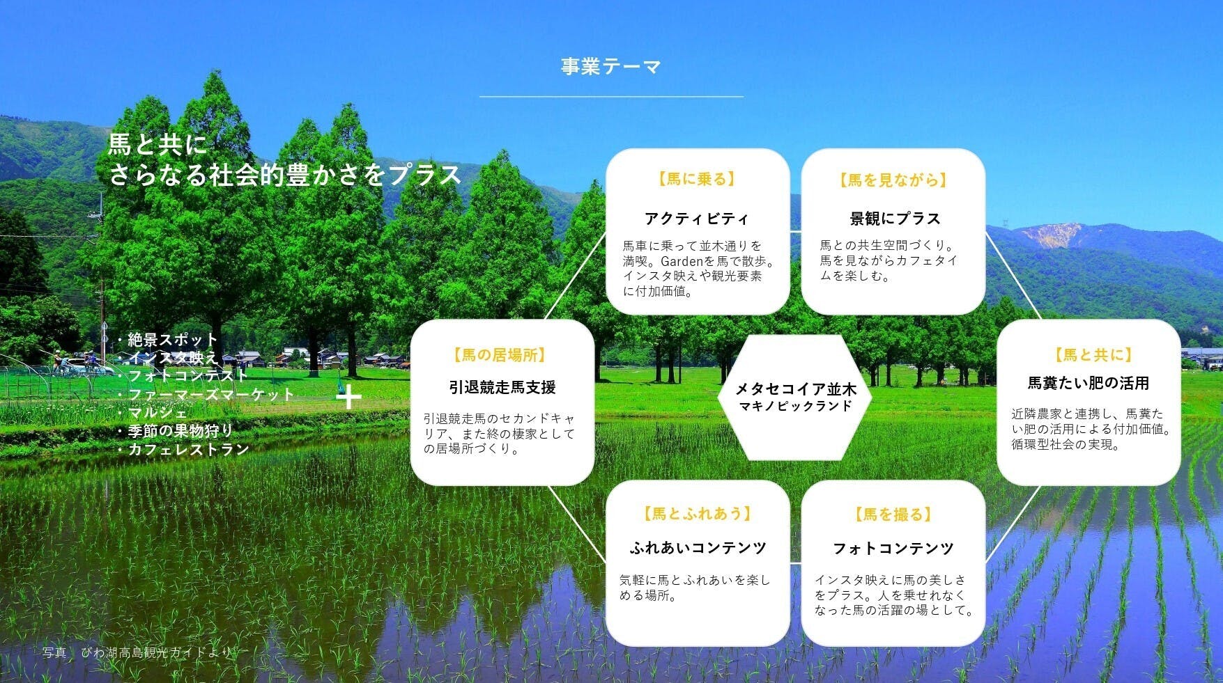 「滋賀県高島市のメタセコイア並木の隣地に、「TCC メタセコイアと馬の森」と銘打った、馬の観光・養老牧場を開設する今回のプロジェクト。