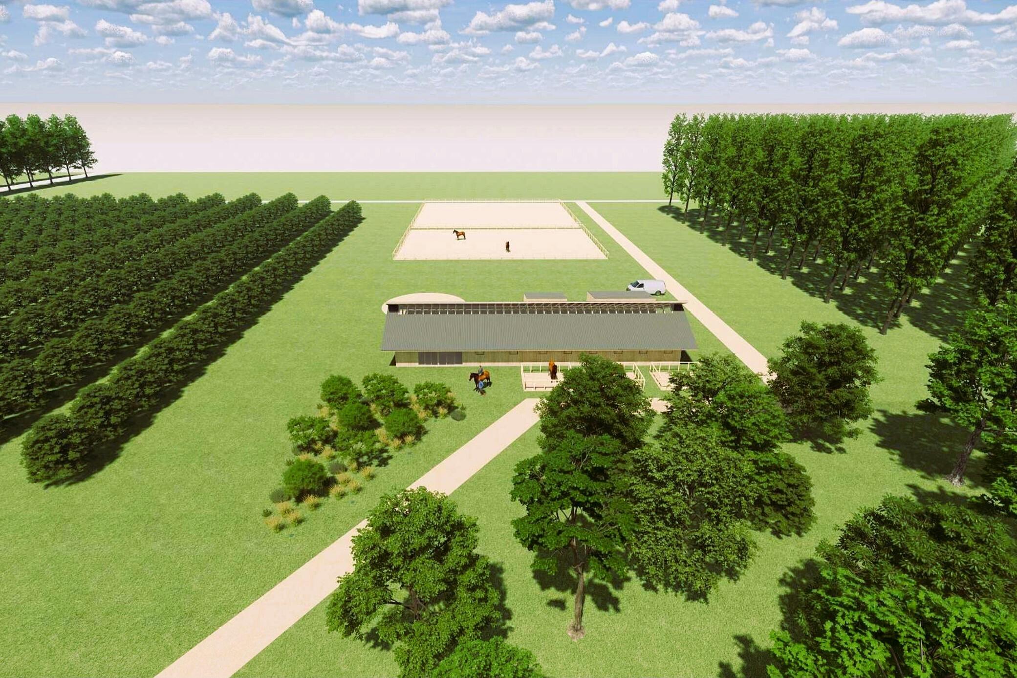 馬の森エリアの 50m程度奥に厩舎を配置し、さらにその奥が運動馬場や放牧地エリアとなります。