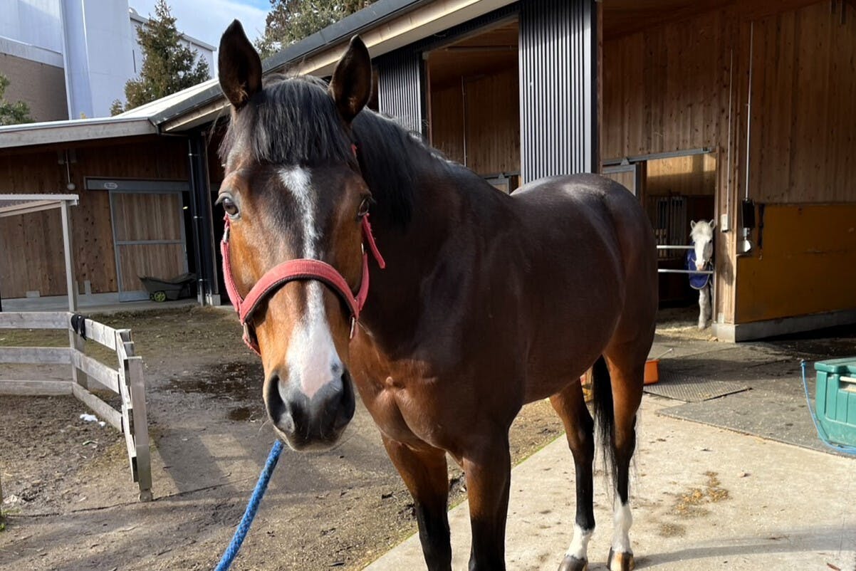 ナリタミニスターと同様に重度の蹄骨骨折により人を乗せるお仕事が難しいため、ふれあいや写真撮影のお仕事を担当します。