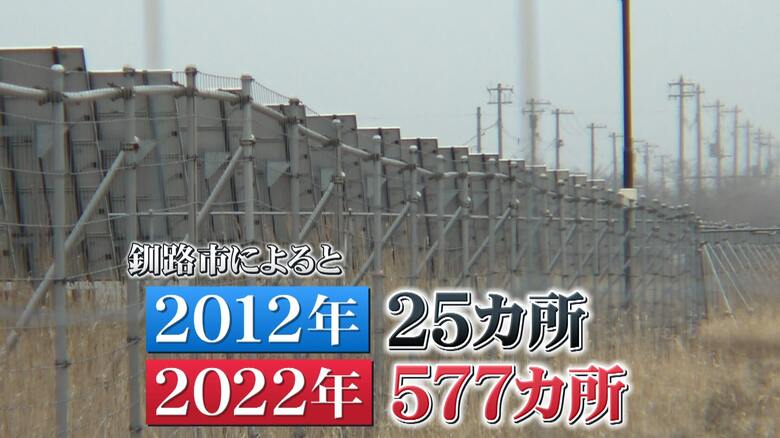 釧路市内で稼働中もしくは建設が認められている太陽光発電所は、2012年の25カ所から、最新のデータでは577カ所と20倍以上に膨れ上がっています。