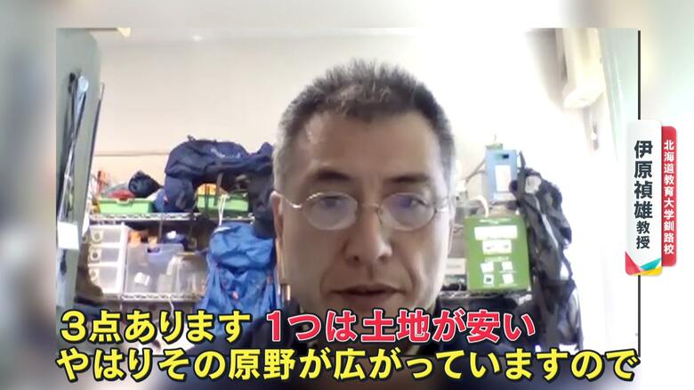 3点あります。1つは土地が安い。やはりその原野が広がっていますので、かなり土地が低価格で購入できます。もう1つがですね、土地が非常に真っ平らですから整備するのもお金がかからない。3つ目が、冬の降雪量が少なくて晴れた日が続いて、いわゆる日照量、これが確保できる。